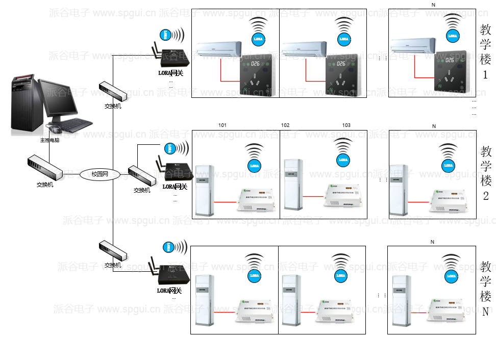 基于電力辦公區(qū) “強(qiáng)電磁干擾、多層分散布局、多品牌設(shè)備混雜” 的核心特性,最終選定廣州派谷 LoRa 通訊系列空調(diào)節(jié)能控制系統(tǒng),構(gòu)建 “終端智能控制 + LoRa 無(wú)線傳輸 + 云端平臺(tái)管理” 的三層架構(gòu),核心選型邏輯圍繞 “場(chǎng)景適配” 展開(kāi),而非單純追求設(shè)備參數(shù)。?